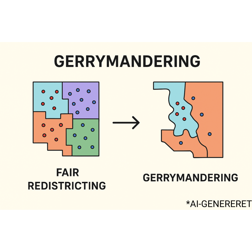 Kort sagt: i stedet for at lave valgkredse, der afspejler befolkningens naturlige fordeling, bliver linjerne manipuleret, så ét parti får flere sikre stemmer, mens modstandernes stemmer bliver “spredt ud” eller koncentreret, så de mister indflydelse.